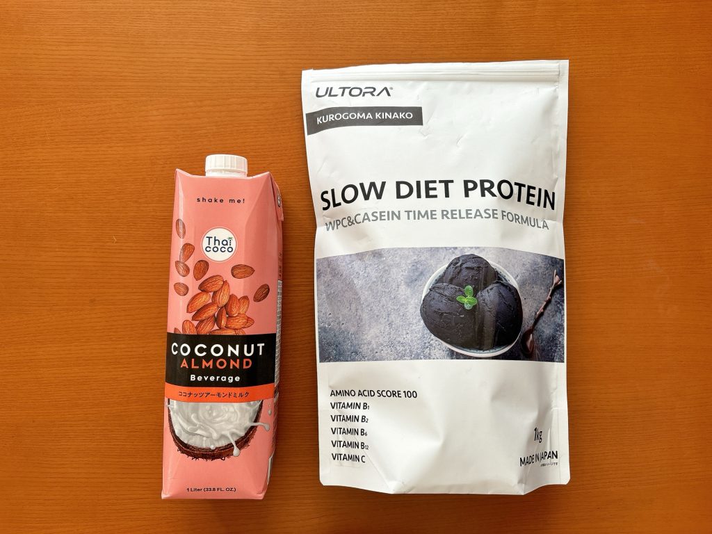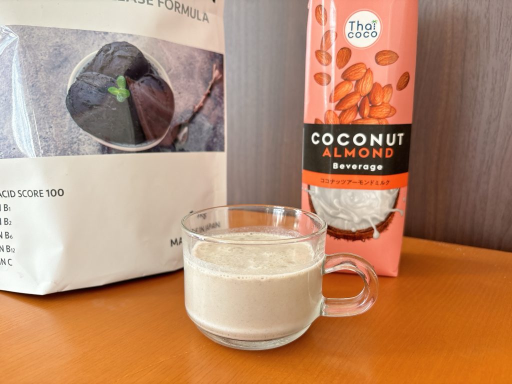 いつも飲むときは水で割って飲んでいたのですが、ふと思い立って、業スーのココナッツアーモンドミルクでプロテインを作ってみると、びっくりするくらいに美味しい!