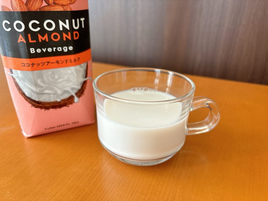 ココナッツミルクとアーモンドミルクは好きだけれど、ココナッツウォーターはそこまで得意ではないので、全部混ざったらどんな風味何だろうと思っていたのですが、ココナッツウォーター独特のクセとかはあまり感じず、ココナッツミルクとアーモンドの風味の方が際立っている感じ。