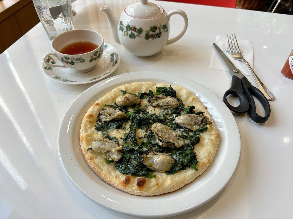 カキとホウレン草のピザとオリジナルブレンドティー