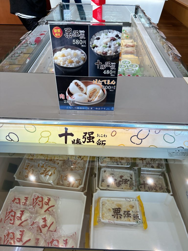 お会計は伝票を売場のレジに持っていて支払うのですが、商品をひと通りチェックしてみると、冷凍ケースに入っていた栗おこわ(580円)が美味しそうだったので買ってみました。