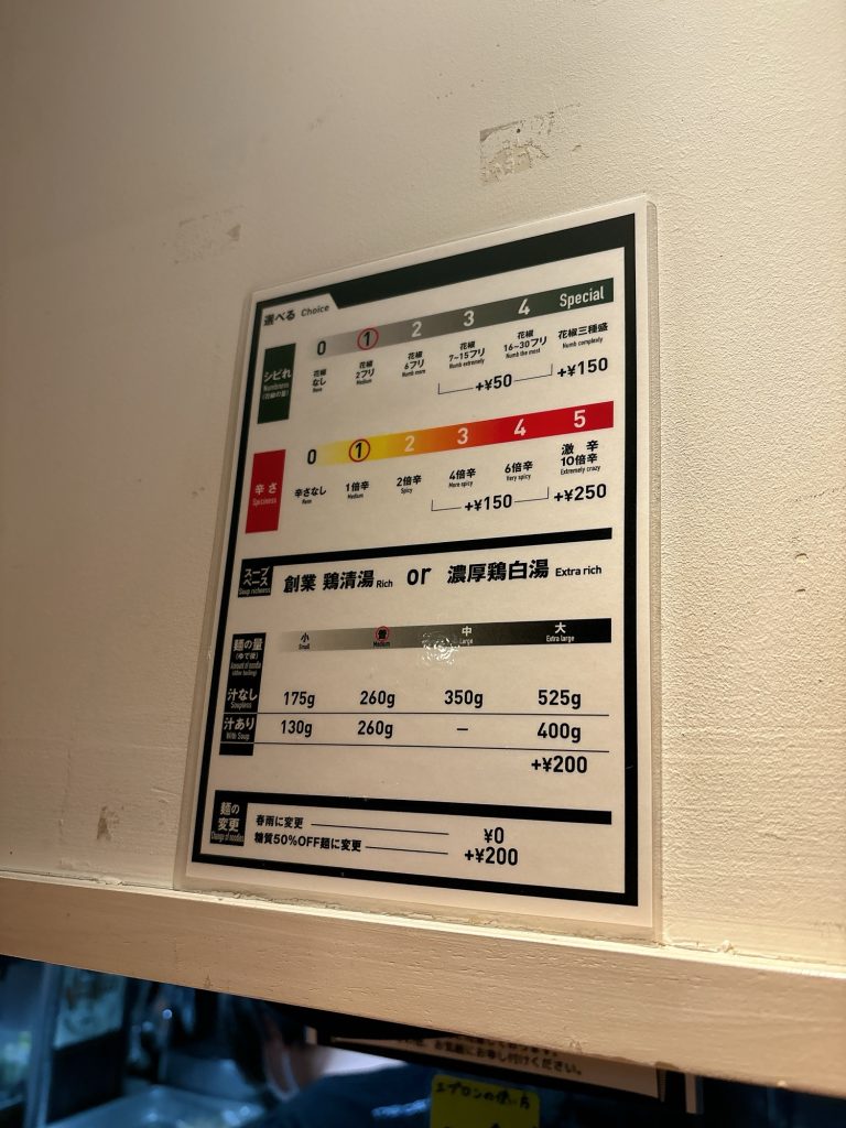 その時、辛さとシビレ(花椒)の量を聞かれるので、番号で伝えます。
